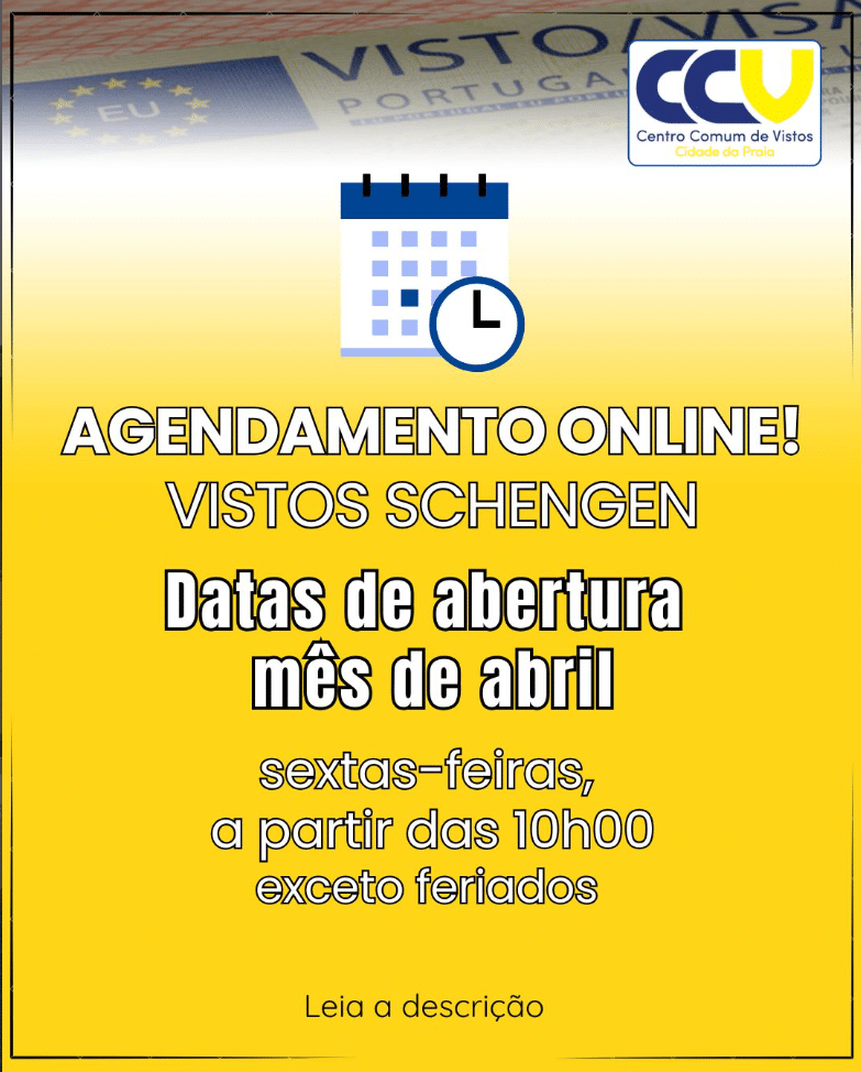 Consulte aqui as datas de abertura de vagas para agendamento online no portal E-VISA de pedidos de visto Schengen (vistos de curta duração) para o mês de abril, no Centro Comum de Vistos (CCV), na Praia: